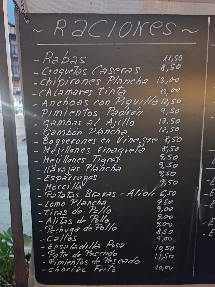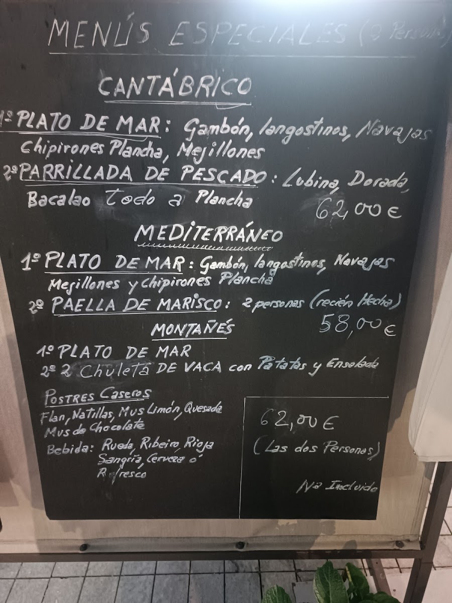 The selection includes typical Spanish tapas such as Croquetas Caseras and Ensaladilla Rusa, as well as seafood options like Paella de Marisco, Parrillada de Marisco, Gambones A la Plancha, and Parrillada de Pescado. Meat dishes are represented by items such as Entrecot de Ternera Con Patatas Y Pimientos and Calcula de Pollo Y Huevos Fritos. Traditional Cantabrian dishes like Cocido Montañés are also available. Salads and lighter plates include Ensalada Mixta and Ensalada de Langostinos Y Piña.